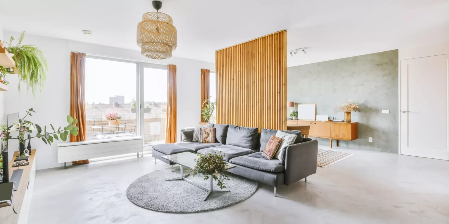 Bright modern living room with marble table, neutral sofa, gold-framed mirror, and potted plants — showcasing the five Feng Shui elements in decor.
